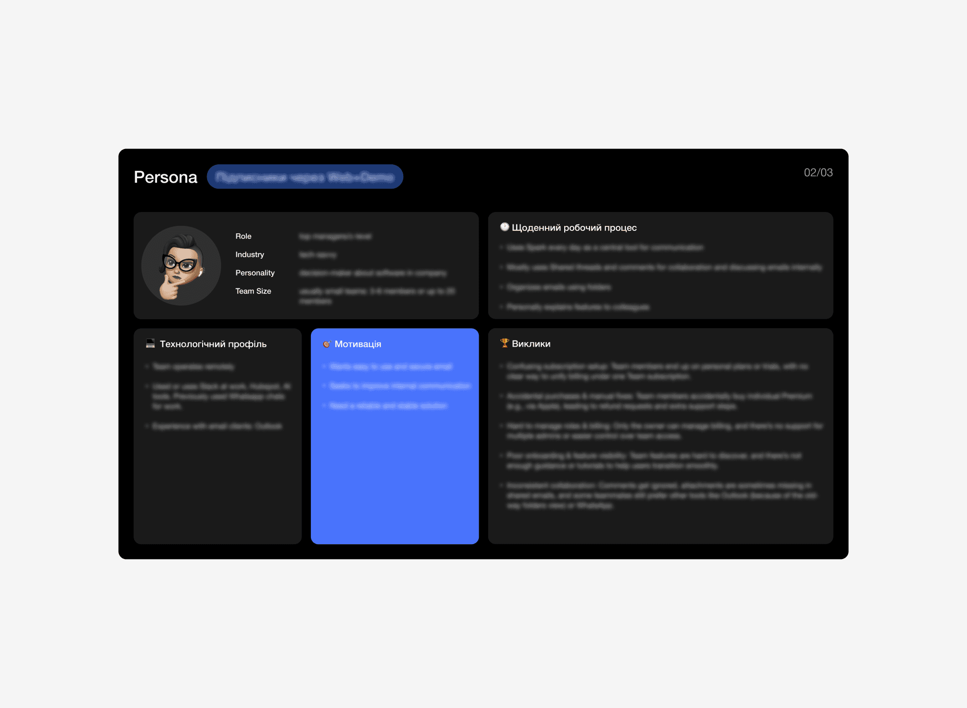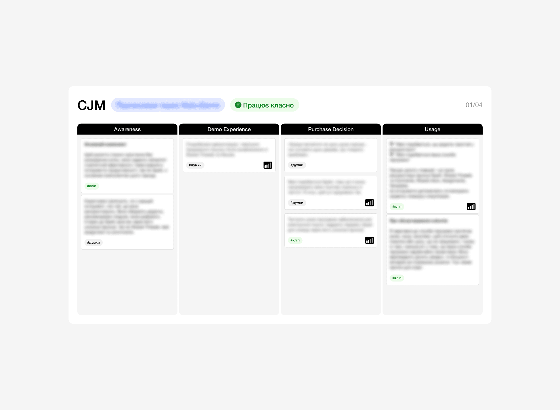 To build the customer journey map, we grouped similar insight cards from different respondents and tagged them with themes and signal strength — the more signals, the more common the insight. This helped us prioritize findings and map them across key user journey stages. Based on this structure, we also developed user personas that reflected typical user goals, behaviors, and pain points.
