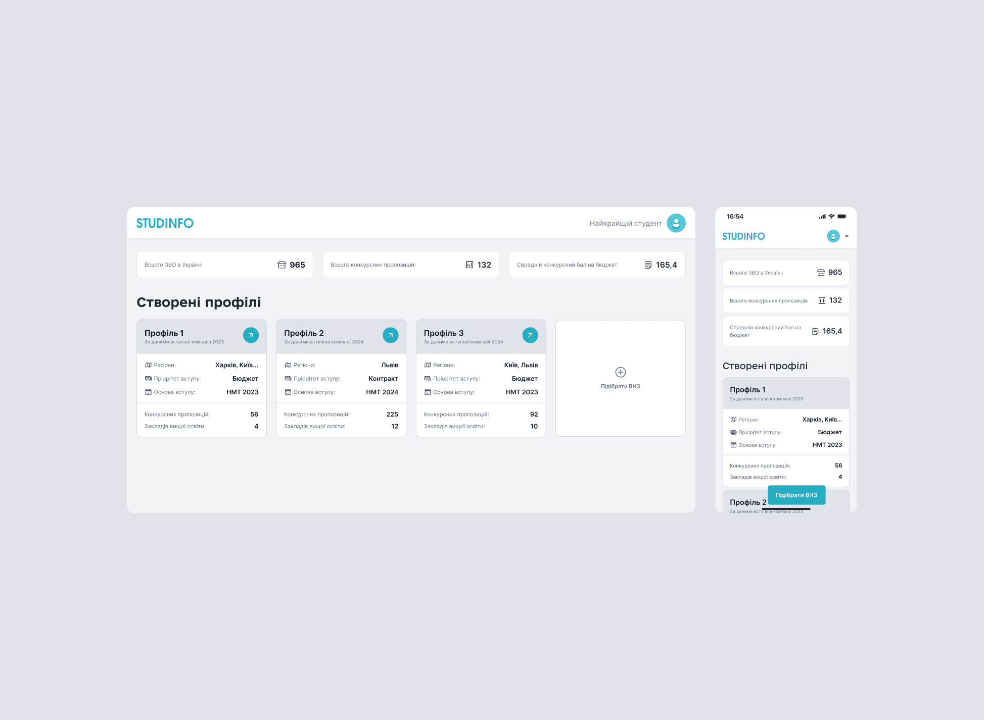 • Designed: Saved profiles, Personalized profile page, Competitive offer page, Profile settings page, Study materials for NMT preparation