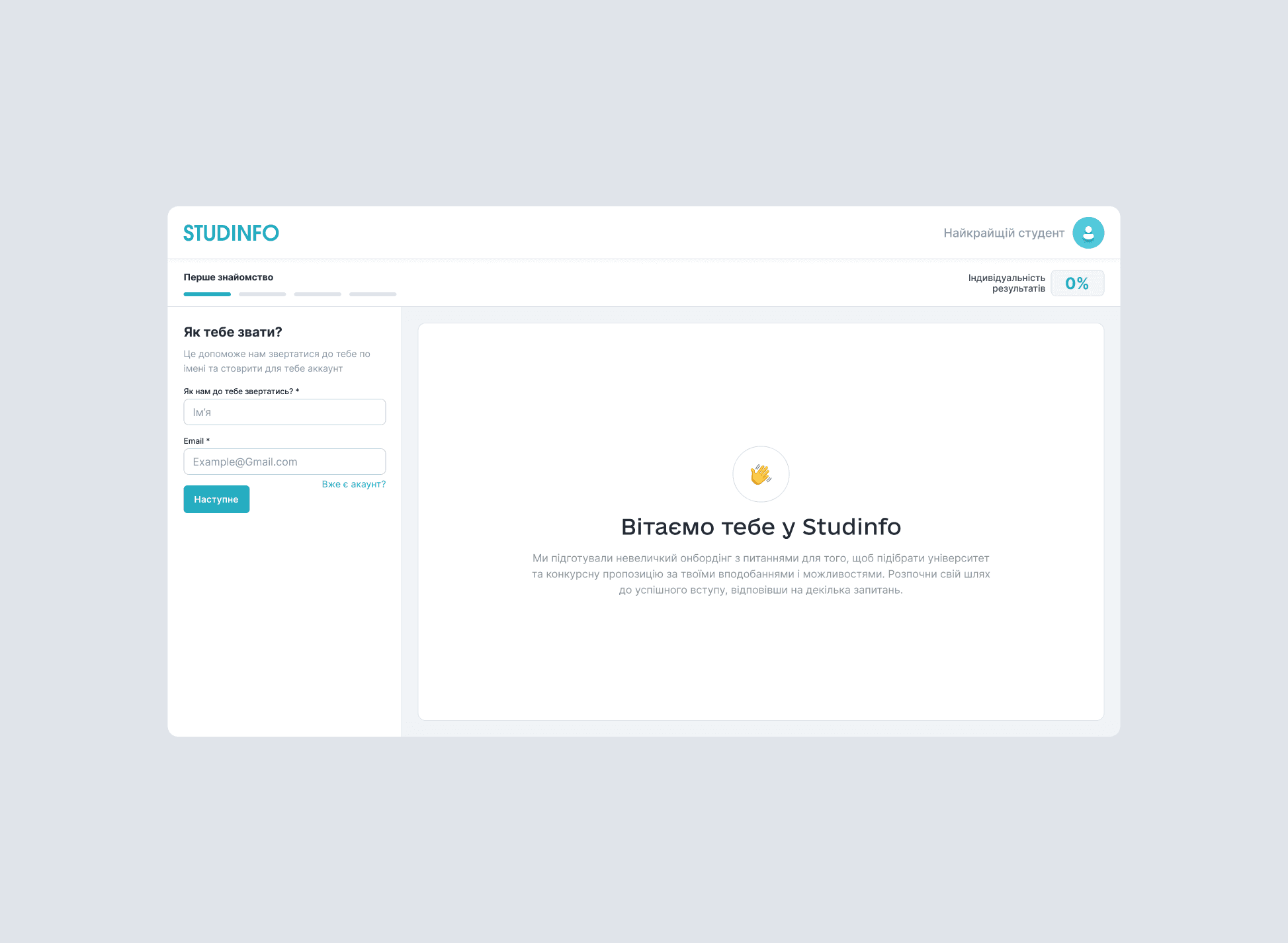 • Registration and onboarding, featuring a questionnaire where users enter their NMT results and interests, and instantly receive personalized suggestions.